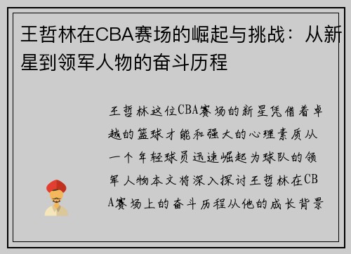 王哲林,这位CBA赛场的新星,凭借着卓越的篮球才能和强大的心理素质,从一个年轻球员迅速崛起为球队的领军人物。本文将深入探讨王哲林在CBA赛场上的奋斗历程,从他的成长背景到技术进步,再到在比赛中的挑战,以及他作为团队核心的责任与担当。通过分析这四个方面,我们不仅能够更好地理解王哲林的个人魅力,也能看出...